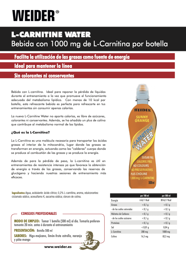 La nueva L-carnitine Water no aporta calorías, es libre de azúcares, colorantes ni conservantes. Además, se ha añadido un plus de colina que contribuye al metabolismo normal de los lípidos.