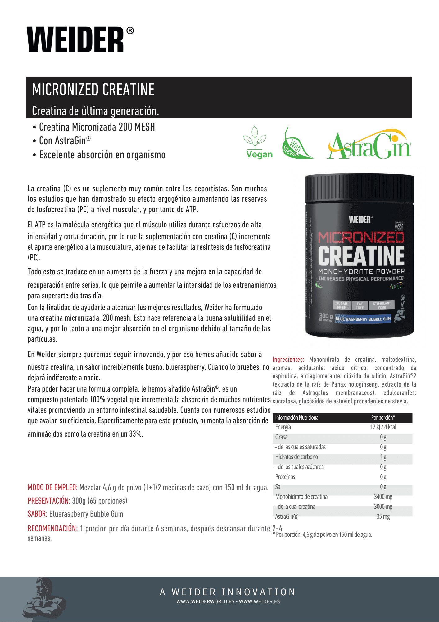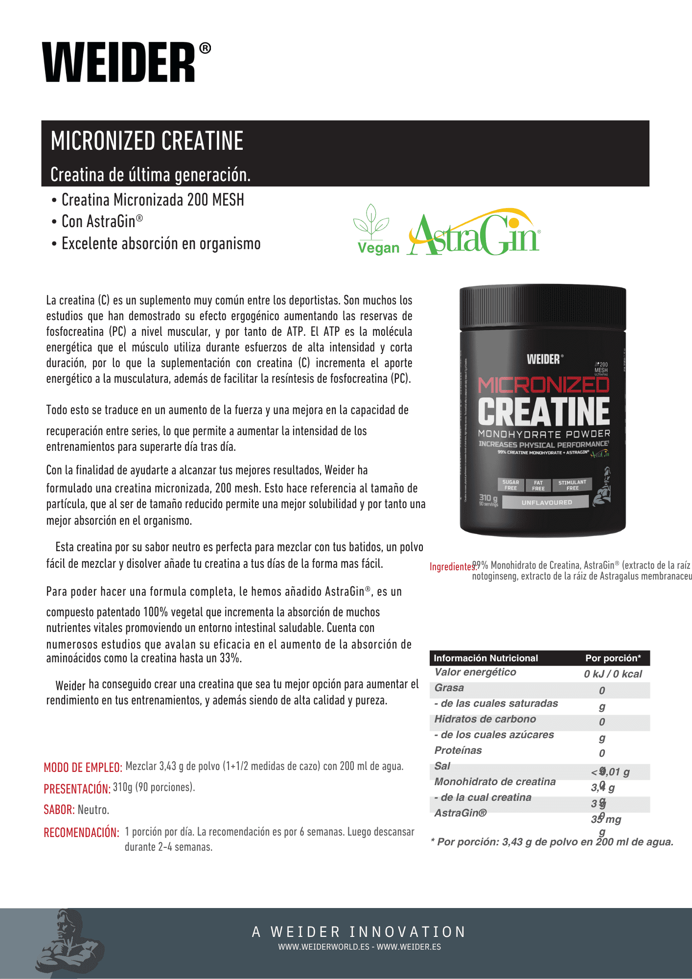 Con la finalidad de ayudarte a alcanzar tus mejores resultados, Weider ha formulado una creatina micronizada, 200 mesh. Esto hace referencia a la buena solubilidad en el agua, y por lo tanto a una mejor absorción en el organismo debido al tamaño de las partículas.
