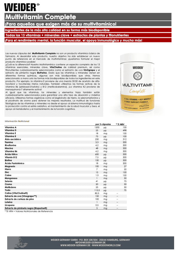 Las nuevas cápsulas del Multivitamin Complex no son un producto vitamínico básico de farmacia. Al desarrollar este producto, nuestro objetivo ha sido establecer un nuevo punto de referencia en el mercado de multivitaminas: ¡queríamos formular el mejor producto vitamínico posible! ¿Cuál es la diferencia? Nuestro Multivitamínico contiene un espectro completo de los 13 vitaminas esenciales, minerales clave, VitaCholine de calidad premium, así como fitonutrientes cuidadosamente seleccionados como el extracto de uva VinOgrape y el extracto de pimienta negra BioPerine. Dado que las vitaminas y minerales vienen en diferentes formas químicas, algunas son más biodisponibles que otras. Hemos seleccionado a mano solo las formas más biodisponibles de todos los ingredientes en este producto. Por ejemplo, la vitamina E proviene de una mezcla 50:50 de acetato de alfa-tocoferol y tocoferoles mixtos naturales. También utilizamos las formas activas de la vitamina B6 (piridoxal-5-fosfato) y B12 (metilcobalamina). ¡La vitamina K2 proviene de menaquinona-7 altamente activa! Al igual que las vitaminas, los minerales y elementos traza también están cuidadosamente seleccionados para garantizar una alta tasa de absorción y máxima eficacia. Utilizamos formas orgánicas como el bisglicinato de hierro, la selenometionina y el picolinato de cromo para obtener los mejores resultados. La multitud de funciones fisiológicas de las vitaminas y minerales va desde el apoyo al sistema inmunológico hasta la protección contra el estrés oxidativo, el mantenimiento de la salud muscular y ósea, el apoyo al metabolismo y el mantenimiento de la función cognitiva
