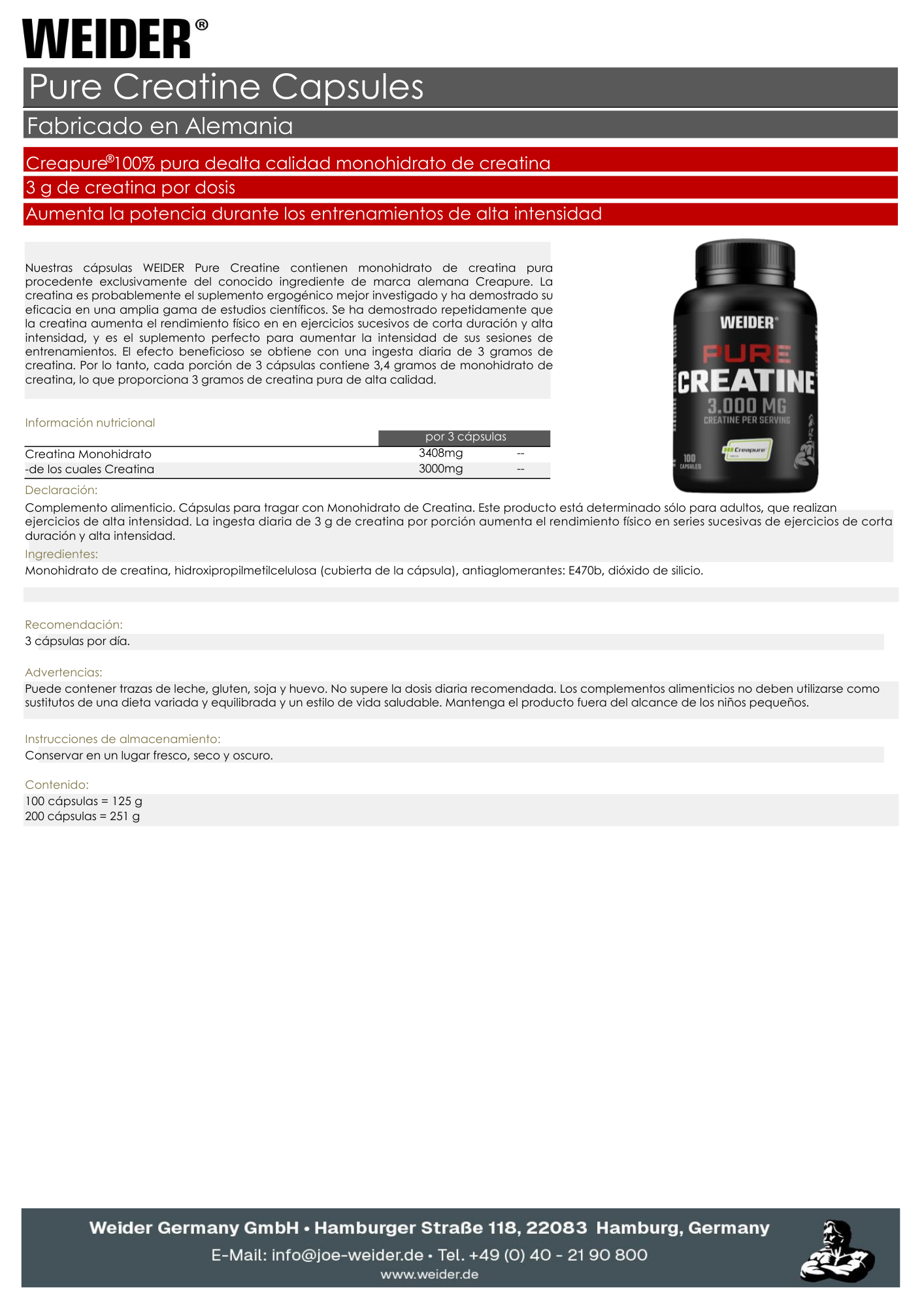 - Creapure® 100% pura de alta calidad monohidrato de creatina
