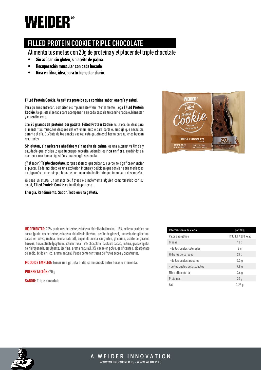 Cada Filled Protein Cookie Triple Chocolate contiene 20 g de proteína, lo que la hace ideal para apoyar la recuperación y el crecimiento muscular.