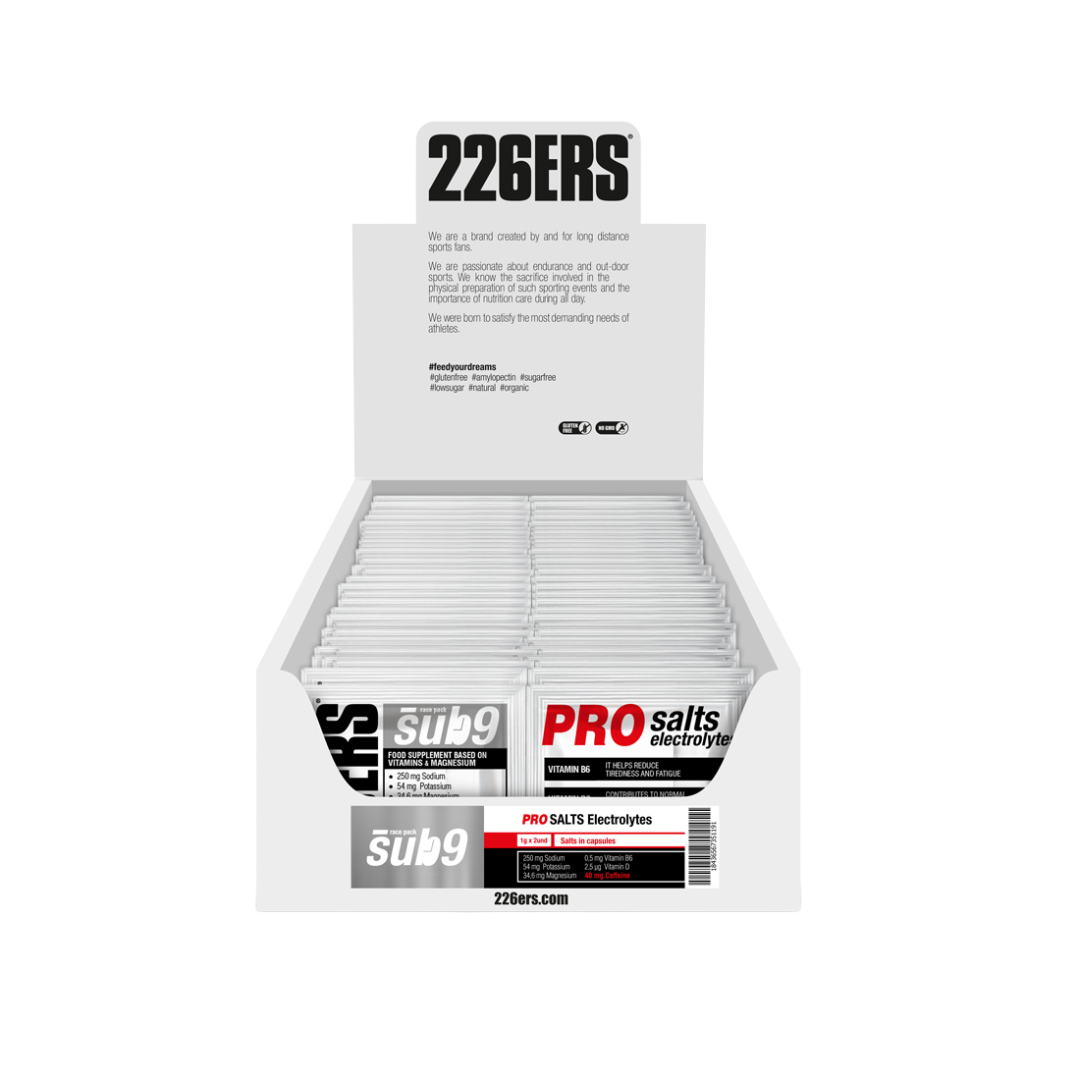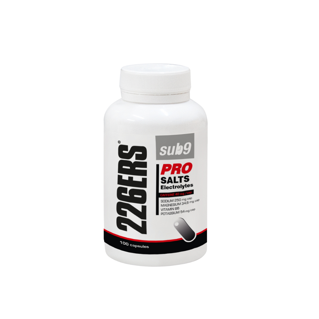 SUB9 PRO SALTS ELECTROLYTES aportan una proporción adecuada de sales y minerales que se pierden por la sudoración durante el ejercicio y la competición, re-hidratando nuestro organismo para un buen funcionamiento.