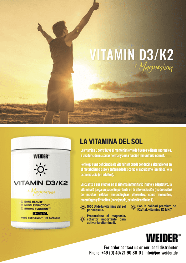 Dado que teóricamente el cuerpo humano es capaz de producir suficiente vitamina D por sí mismo, en realidad la vitamina D no es realmente una vitamina, sino una hormona. Para producir vitamina D, el cuerpo necesita tanto el colesterol precursor como la radiación UV-B del sol, y aquí es donde se vuelve difícil para la mayoría de las personas: Pasamos la mayor parte de nuestro tiempo en interiores. Cuando salimos de casa, cubrimos la mayoría de nuestra piel productora de vitamina D con ropa. Durante el verano, usamos protector solar para protegernos de los efectos potencialmente dañinos del sol, ¡y así inhibimos la síntesis de vitamina D! Aparte de eso, tanto nuestra edad como nuestro tipo de piel tienen una gran influencia en nuestra producción de vitamina D. En la mayoría de las partes de Europa, el ángulo con el que el sol alcanza la Tierra es demasiado bajo, lo que significa una exposición insuficiente a los rayos UV-B para la síntesis de vitamina D. Un cielo nublado también impide una radiación UV-B además, los alimentos ricos en vitamina D son raros por lo que obtener vitamian D a través de los alimentos apenas es posible y se recomienda la sumplementación de la misma. La vitamina D contribuye al mantenimiento de huesos y dientes normales, a una función muscular normal y a una función inmunitaria normal. Por lo que una deficiencia de vitamina D puede conducir a alteraciones en el metabolismo óseo y enfermedades como el raquitismo (en niños) o la osteomalacia (en adultos). En cuanto a sus efectos en el sistema inmunitario innato y adaptativo, la vitamina D juega un papel importante en la diferenciación (maduración) de muchas células inmunológicas diferentes, como monocitos, macrófagos y linfocitos (por ejemplo, células B y células T). En WEIDER, nuestra misión es proporcionarte los mejores suplementos nutricionales para que puedas rendir al máximo, vivir una vida saludable y alcanzar tus metas personales. Con más de 85 años de experiencia en esta industria, hemos comprendido la importancia de utilizar solo ingredientes de la mayor calidad y confianza en todos nuestros productos.